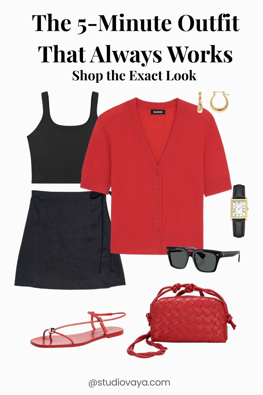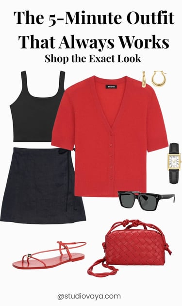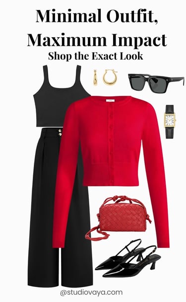 This is your go-to when you don’t want to think. A black base with a red cardigan creates instant contrast and a put-together finish.