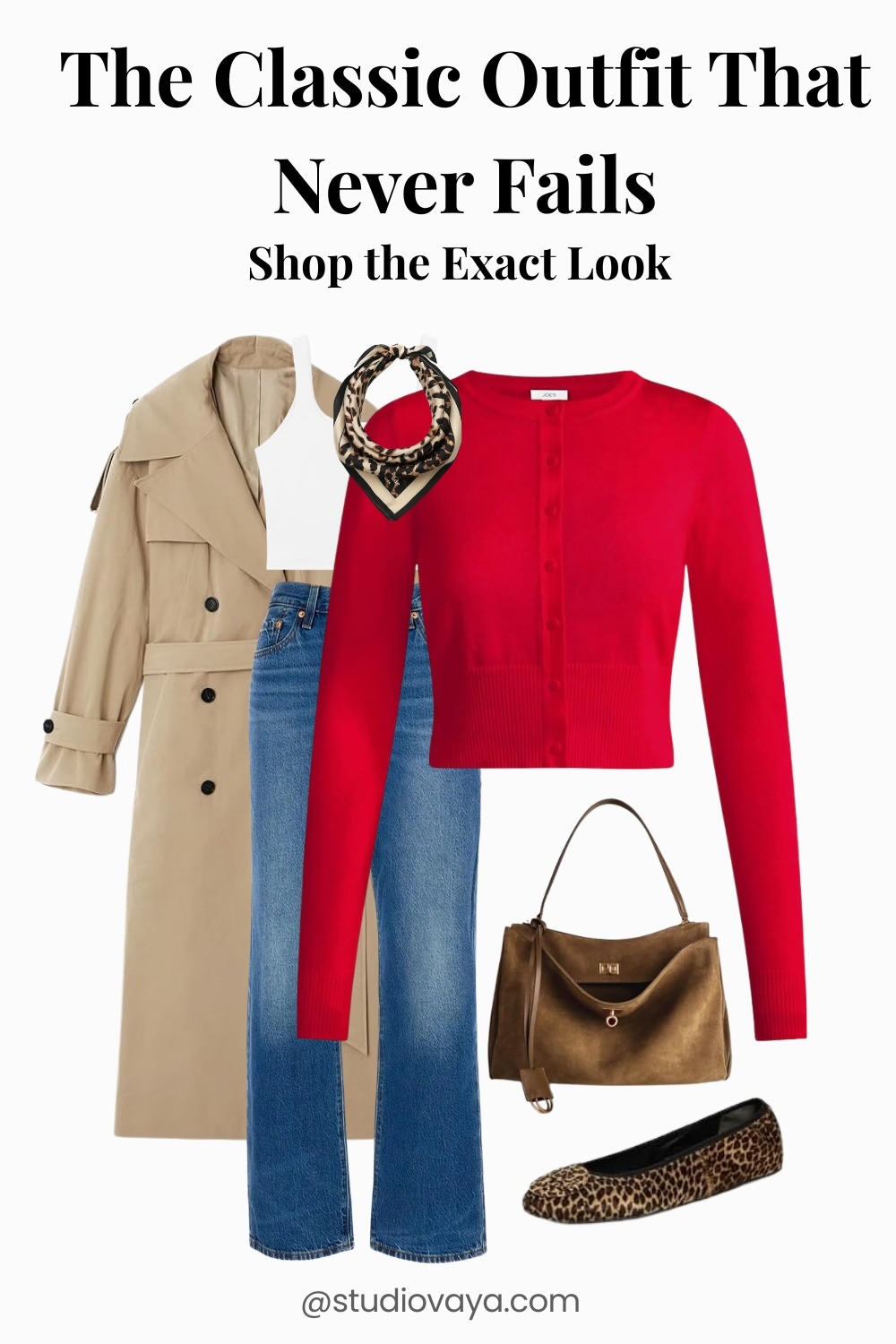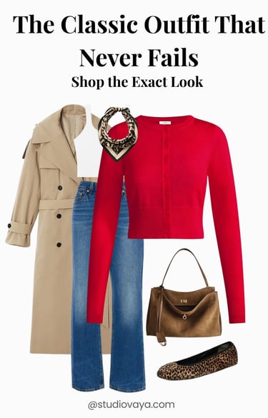A trench coat, denim, and a red knit — timeless pieces that always work together. This is an outfit you can wear anywhere.