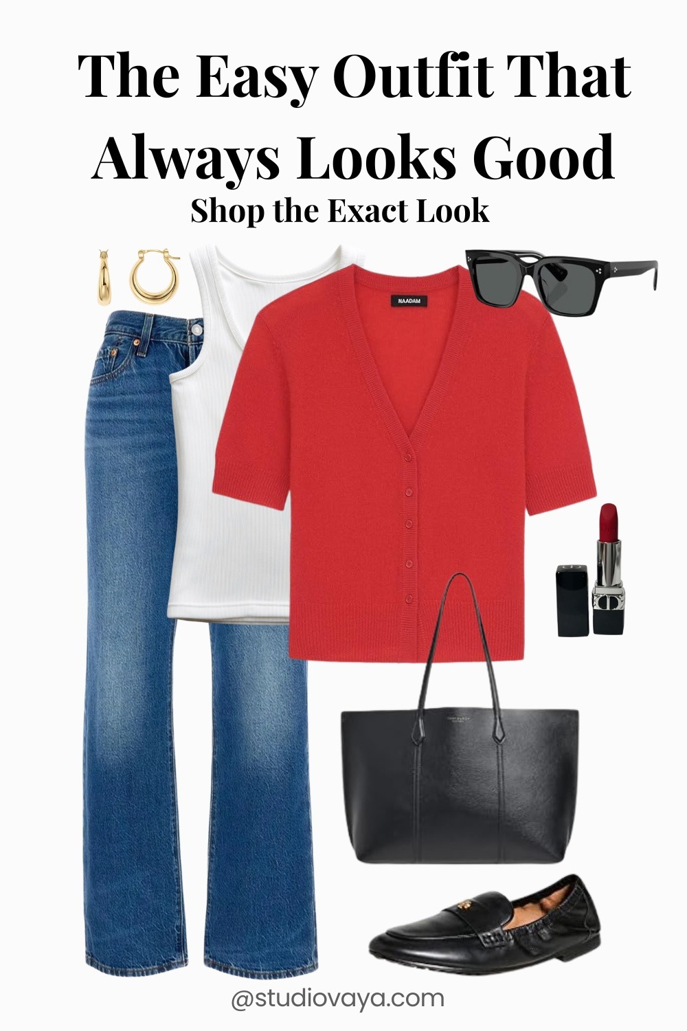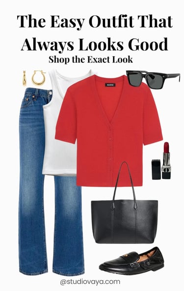 A red cardigan layered over a white tank with classic denim — finished with black accessories for a clean, polished look.