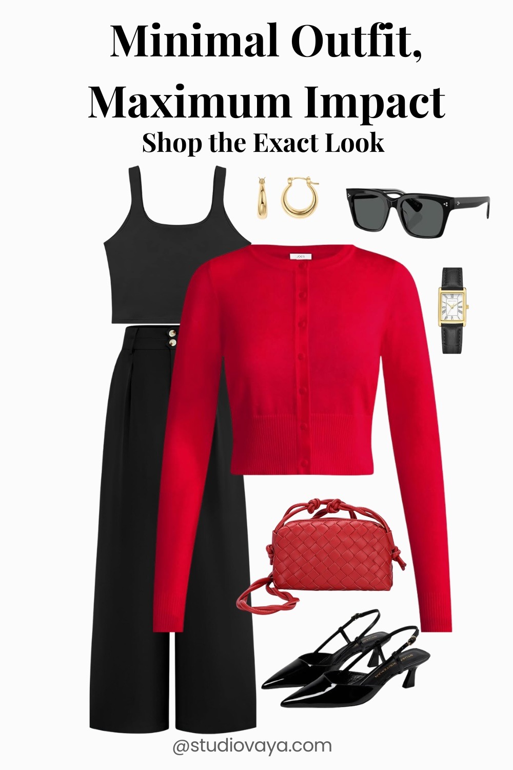Simple black pieces paired with a bold red cardigan create a strong, modern look with minimal effort.