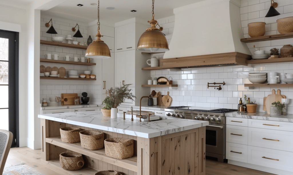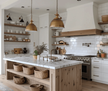 A true heart of the home, the modern cottage kitchen blends function and feeling. White cabinetry meets warm wood tones and brass accents. Open shelving lets you display ceramics and everyday essentials, turning the practical into something beautiful.