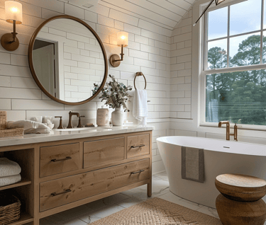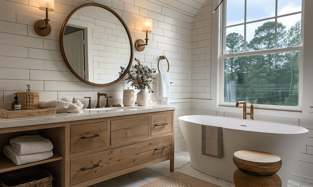In the cottage bathroom, clean lines and tactile materials create a calm retreat. A round mirror, brass fixtures, and soft lighting complement a freestanding tub and warm wood vanity.