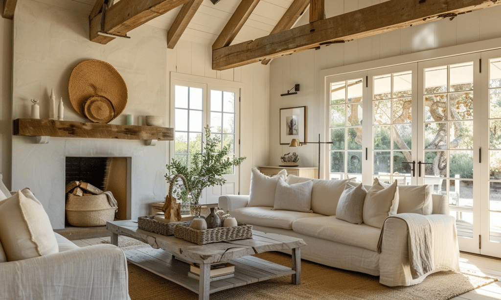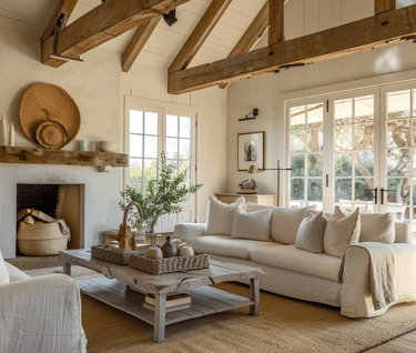 Soft linen sofas, natural jute rugs, and reclaimed wood beams define a space that feels as effortless as it is elegant. The living room becomes a sanctuary — bright yet grounded, minimal yet full of soul. A woven basket over the fireplace mantel adds organic charm, while large windows flood the space with natural light.