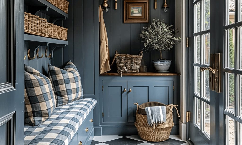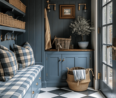 Painted cabinetry in soft blue-greys, woven baskets, and plaid cushions make even the most functional corner feel styled and thoughtful. The checkerboard floor adds a timeless pattern that ties the look together.