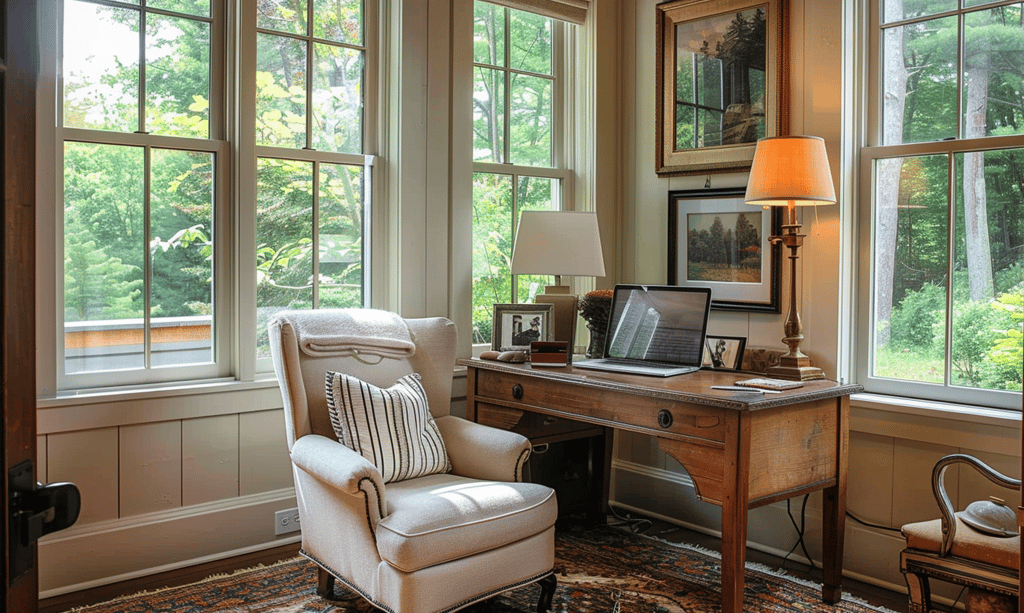 This cozy nook is perfect for quiet moments. A vintage wooden desk, brass lamp, and linen-upholstered chair create a warm and focused environment. Framed art and layered rugs bring a collected charm without cluttering the space.