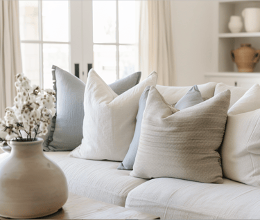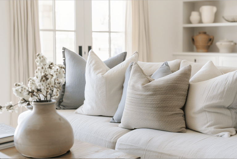 One of the simplest ways to elevate any room is through layered textures. Think soft linen, cozy cotton, and tactile weaves paired together for depth and warmth. In this serene living room, the mix of neutral-toned pillows against a crisp sofa creates a look that feels inviting yet sophisticated. The variation in fabric and subtle shades adds richness without overwhelming the space, proving that luxury lies in the details.