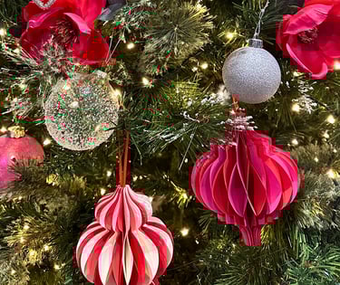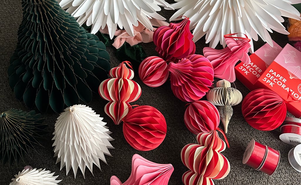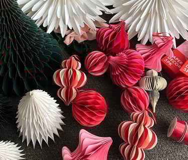 There’s a quiet beauty in these paper honeycomb ornaments — their soft folds, playful shapes, and vivid tones of red, pink, cream, and white feel simple on their own. Yet when combined with glass ornaments, satin ribbons, and twinkling lights, they create a look that’s unexpectedly fun, elegant, and full of dimension. The mix of materials brings the perfect contrast — the matte texture of paper softens the shimmer of glass, giving your Christmas tree both warmth and sophistication.