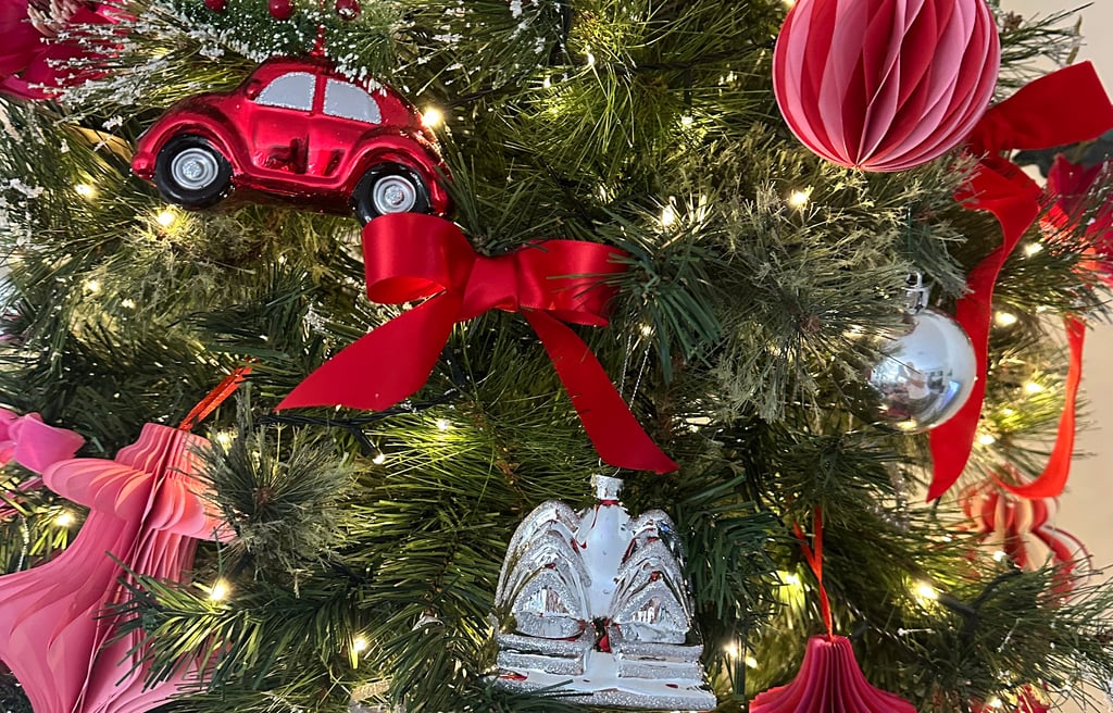 To give the display a personal and organic touch, add whimsical keepsakes such as a glass red car ornament or a glass city ornament, alongside faux pink flowers, red and pink baubles frosted greenery, and silver twigs. These accents introduce subtle layers of nostalgia and nature, balancing shine with texture and sentiment. The result feels collected over time rather than styled in a single season — a Christmas tree that glows not just with light, but with personality and memory.