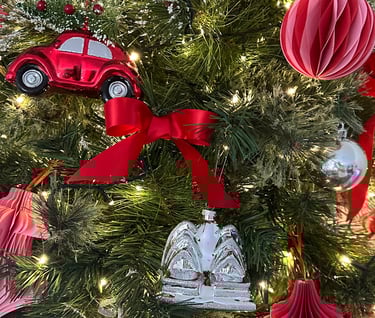 The balance between handcrafted and polished elements is what gives this design its quiet sophistication. The glass ornaments, such as the red vintage car and Sydney Opera House, capture light and sparkle, symbolising elegance and detail. In contrast, the paper ornaments introduce softness and a sense of handmade joy — grounding the shine with texture and authenticity. Together, they prove that beauty often lies in the mix, not the match.