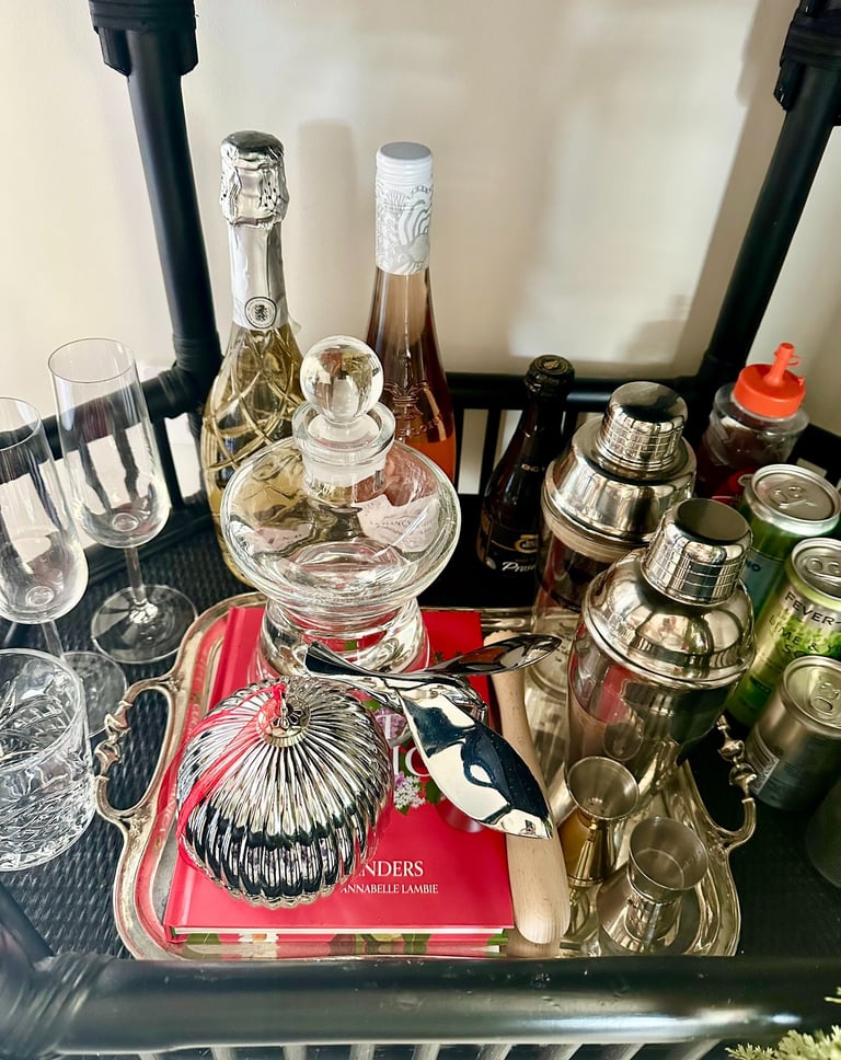 If you’re styling a two-tier cart, use the top for your “hero” décor and the bottom for extra glassware or drinks.