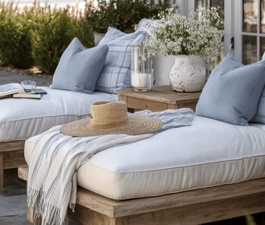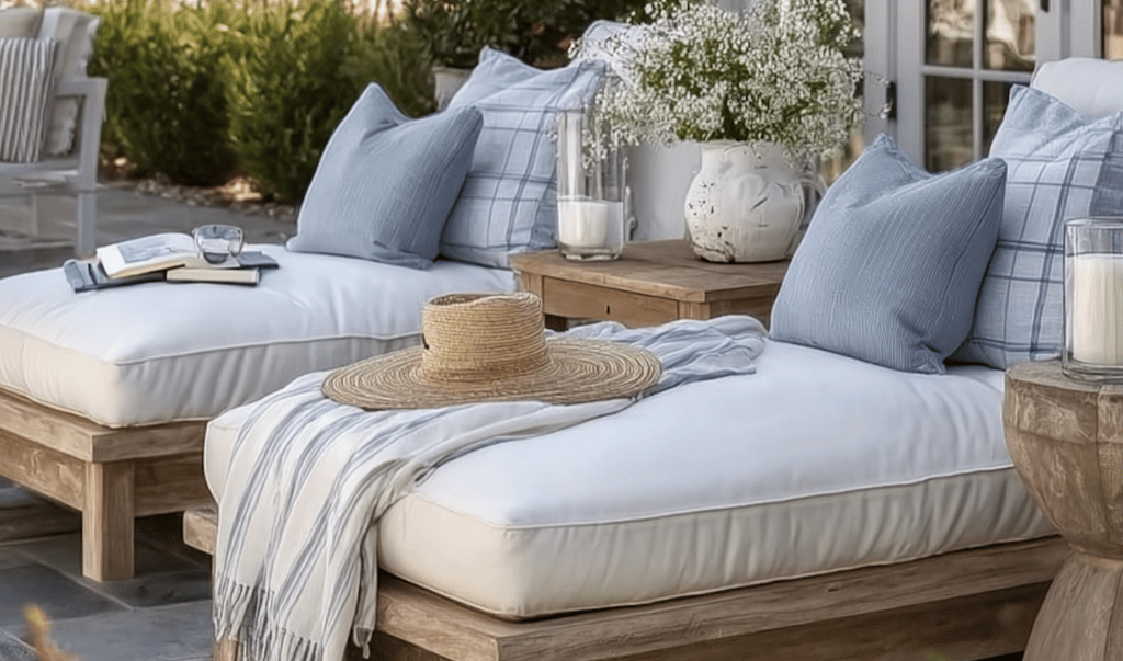 Nothing says laid-back coastal living like oversized loungers. Soft blue pillows, lightweight throws, and casual accents like a straw hat invite you to slow down and enjoy long afternoons by the water.