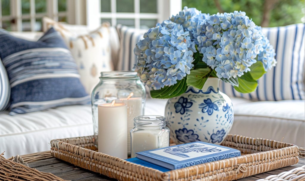 Fresh florals and coastal greenery, such as hydrangeas, eucalyptus, or soft pines, add life and movement to your outdoor space. Displaying them in woven baskets or ceramic planters ties the natural elements back into your overall palette.