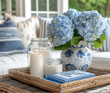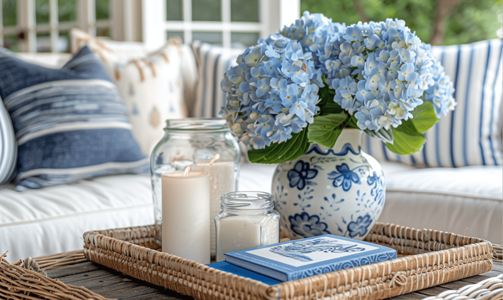 Small details bring a big sense of charm. A woven tray holding blue hydrangeas, candles, and design books adds depth and warmth. Styling with fresh flowers and coastal-inspired ceramics instantly elevates a simple seating area.