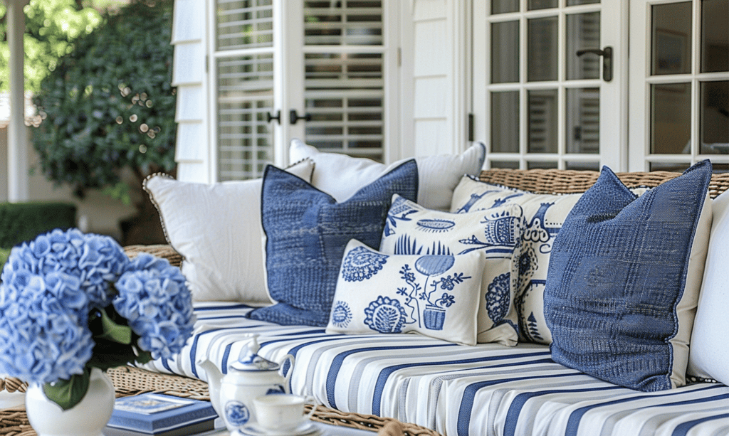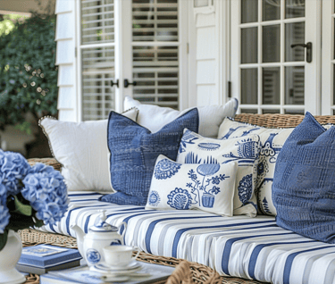 What ties these spaces together is the balance of blue-and-white textiles, natural wicker, fresh florals, and relaxed styling. Whether you have a porch, a garden, or a seaside terrace, layering these classic coastal elements can make any outdoor corner feel timeless, welcoming, and endlessly relaxing.