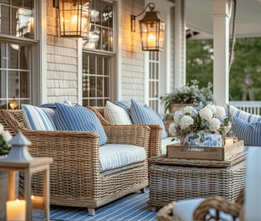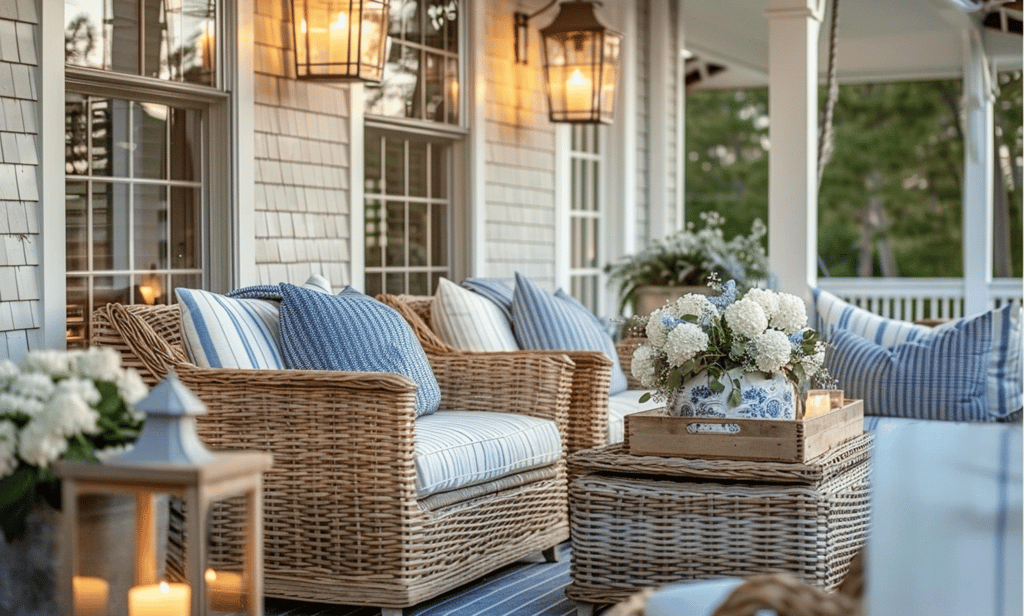 Wicker seating layered with striped and indigo pillows creates a timeless coastal look. The addition of lantern sconces and fresh blooms softens the scene, making it the perfect spot to sip coffee in the morning or relax at sunset.