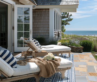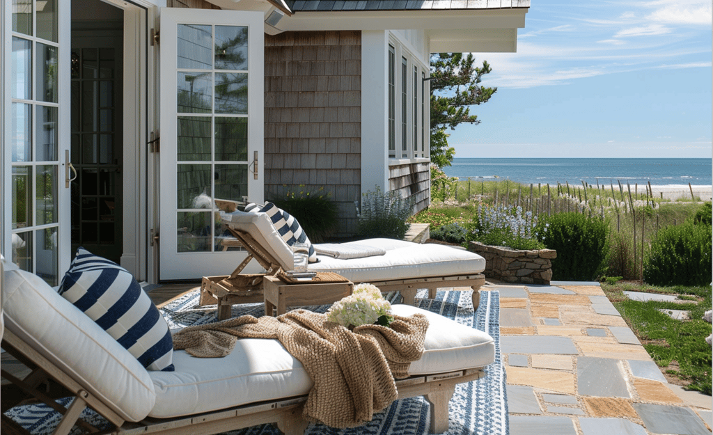 A wide patio framed by sea grasses and ocean views becomes the ultimate escape. Striped cushions, woven throws, and a touch of greenery tie the space back to the same palette seen throughout, creating a cohesive coastal story.