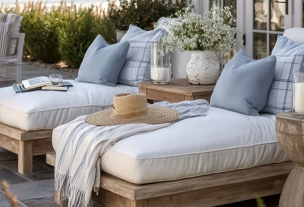To elevate the look further, add oversized pillows in coordinating patterns, a woven outdoor rug, and a small side table styled with lanterns or fresh hydrangeas. This instantly sets a relaxed tone perfect for morning coffee or sunset conversations.