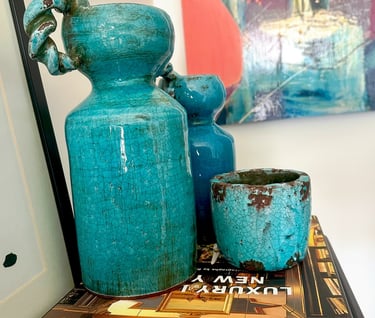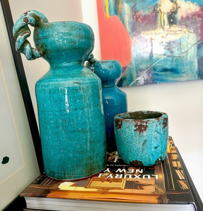 Three turquoise vases with a vintage finish add a fresh touch of color to the table. Their soft, uneven glaze gives them character and texture. On the wall behind, a piece of abstract art mirrors the same tones, tying the whole scene together. The combination feels balanced, simple, and thoughtfully styled.