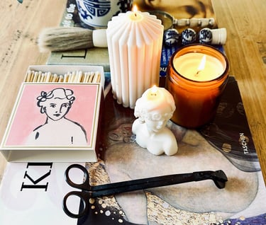 Candles and matchboxes meet art in this intimate moment. The sculpted bust candle, fluted pillar, and amber glass jar cast a gentle glow over pages of Klimt and Monet. The blue-and-white chinoiserie vase with deep red florals lifts the palette, blending classic and modern notes with quiet elegance.