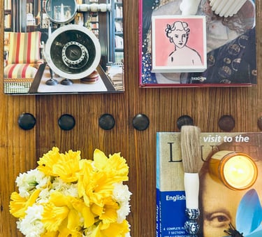 Set on a vintage coffee table with a softly weathered surface, this vignette tells a story of travel, culture, and memory. Layers of art books create a quiet base, while a Chinese calligraphy brush, a softly glowing candle, and a delicate butterfly from MoMA bring texture and movement. A small metal antique cup — a family heirloom — adds history and character, grounding the composition with authenticity. A bundle of bright yellow blooms adds a burst of warmth, balancing the earthy tones with joyful contrast.