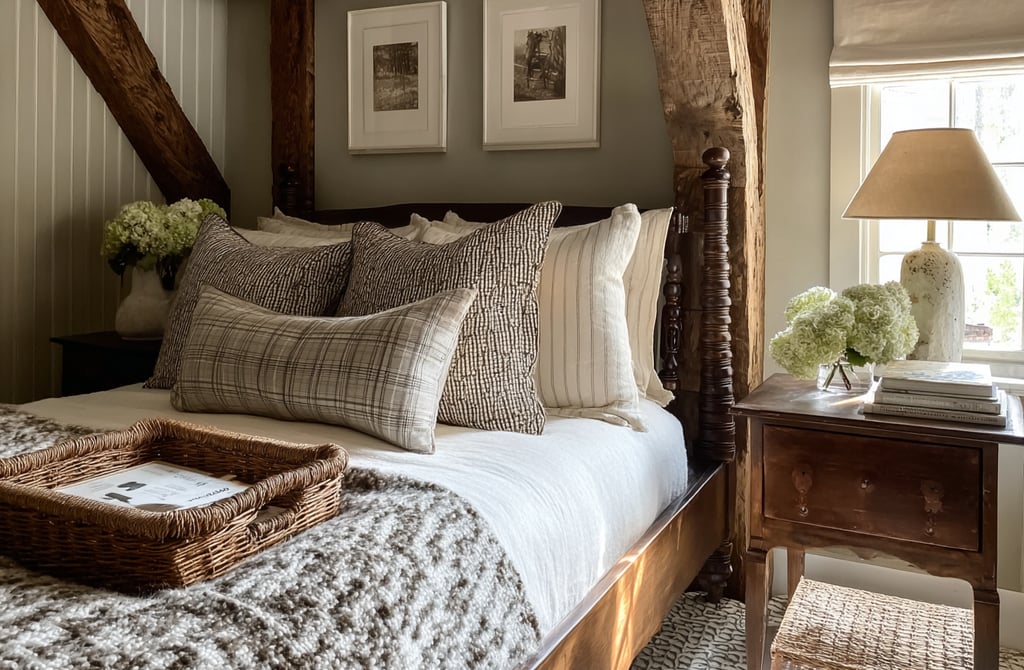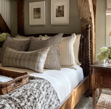 Layered in soft textures and earthy neutrals, this bedroom captures the charm of a countryside retreat — calm, timeless, and effortlessly inviting.