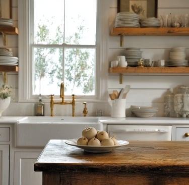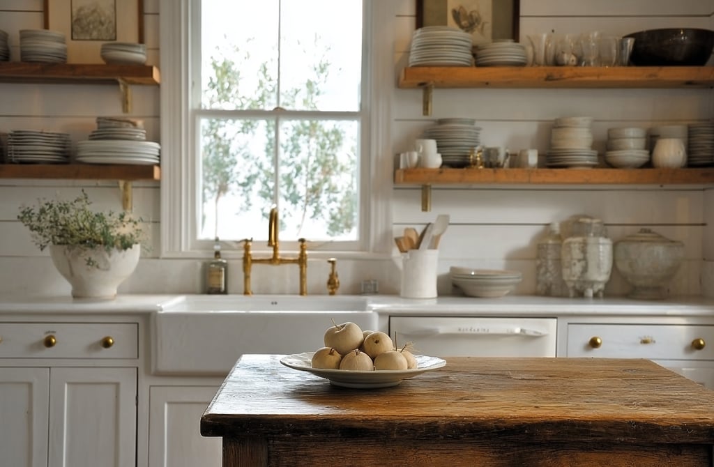 Open wooden shelves display stacks of earthenware dishes and collected ceramics, their imperfections adding charm. Brass fixtures glint softly against shiplap walls, while sunlight filters through a classic farmhouse window. The rustic island, marked by time and use, stands proudly at the center — reminding us that the most beautiful spaces are the ones we truly live in.