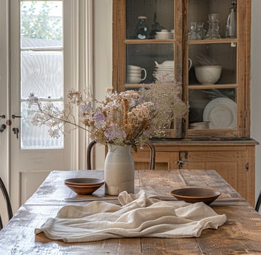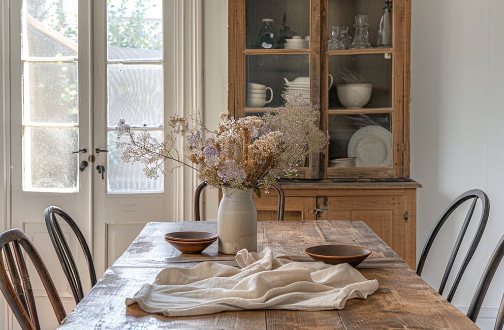 Atop it, a linen runner and wildflower arrangement form a quietly elegant vignette. The mismatched chairs and glass-front cabinet filled with pottery speak to a home built over time, with pieces gathered and loved. It’s a room that invites laughter, candlelight, and long conversations — proof that warmth is always found in the details.