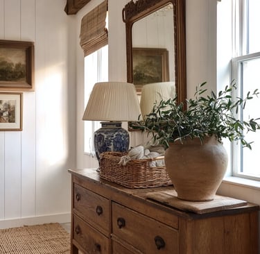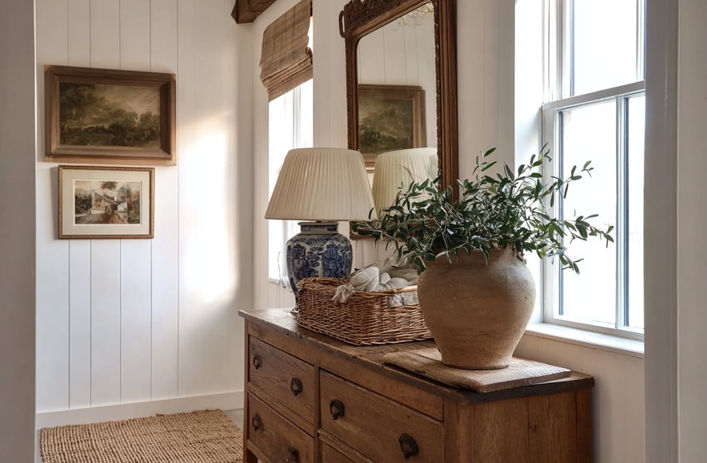 A solid oak dresser anchors the space, styled with a vintage lamp, a woven basket, and a clay urn filled with olive branches.
