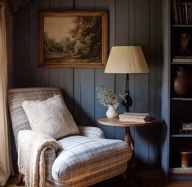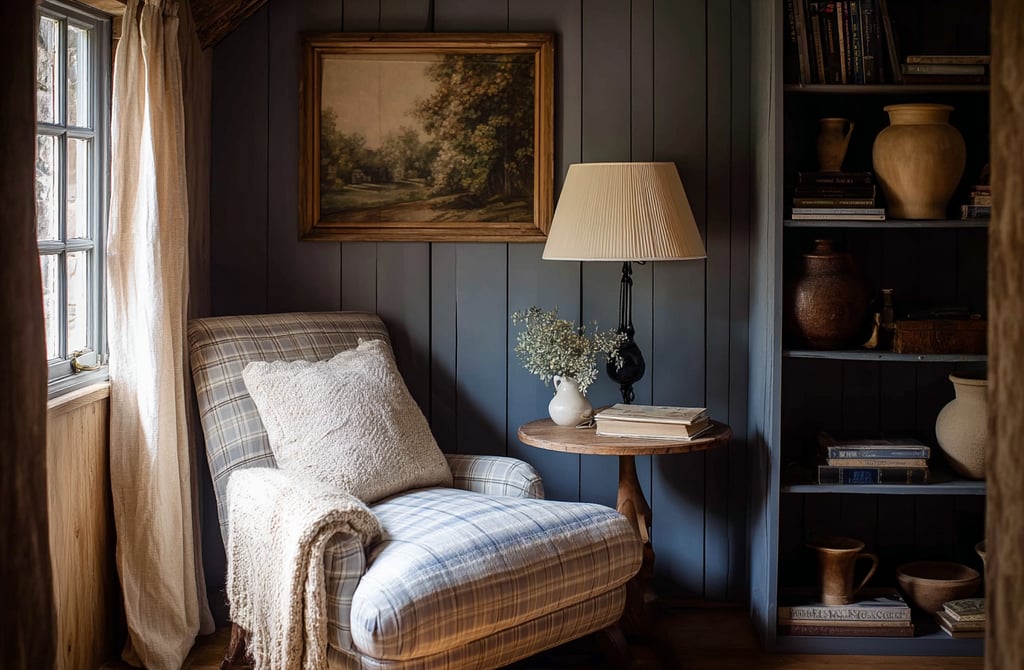 The dark blue-gray paneling creates a cocooning mood, balanced by a checked armchair and soft beige curtains.