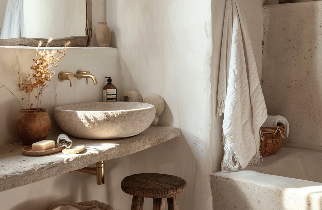 A hand-carved stone basin rests on a textured ledge, paired with brushed brass tapware that glows softly in the light.