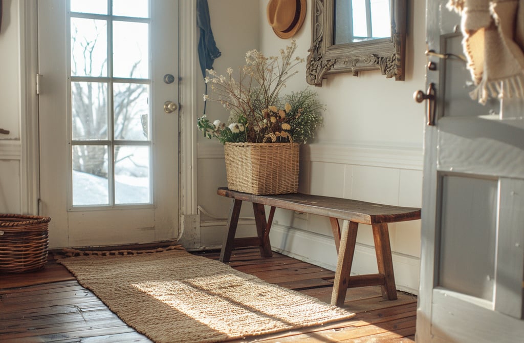 Rustic Wooden Bench – A timeless piece that brings warmth and simplicity to your entryway styling.