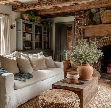 This living room embodies everything we love about the earthy cottage aesthetic — soft linen slipcovers, weathered wood, and a crackling fire framed by stone and brick.
