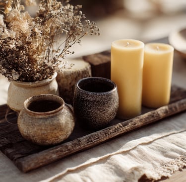Here, a rustic wooden tray holds handmade pottery, beeswax candles, and a bundle of dried blooms — a perfect example of how earthy textures bring warmth to any space.