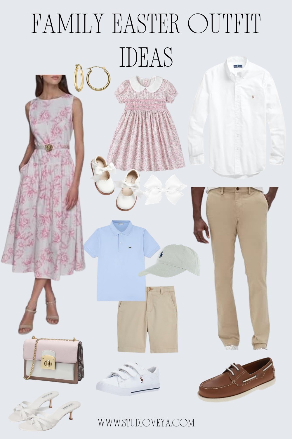 1. Floral Sundress 2. Gold Hoop Earrings 3. Crossbody Bag 4. Steve Madden Heels 5. Girls Summer Dress 6. Girl Shoes 7. Hair Bow 8. Lacoste Boy Polo 9. Ralph Lauren Boys Cap 10. Boy Shorts 11. Polo Ralph Lauren Boy Shoes 12. Polo Ralph Lauren Mens Shirt 13. Gap Pants 14. DOCKERS Shoes