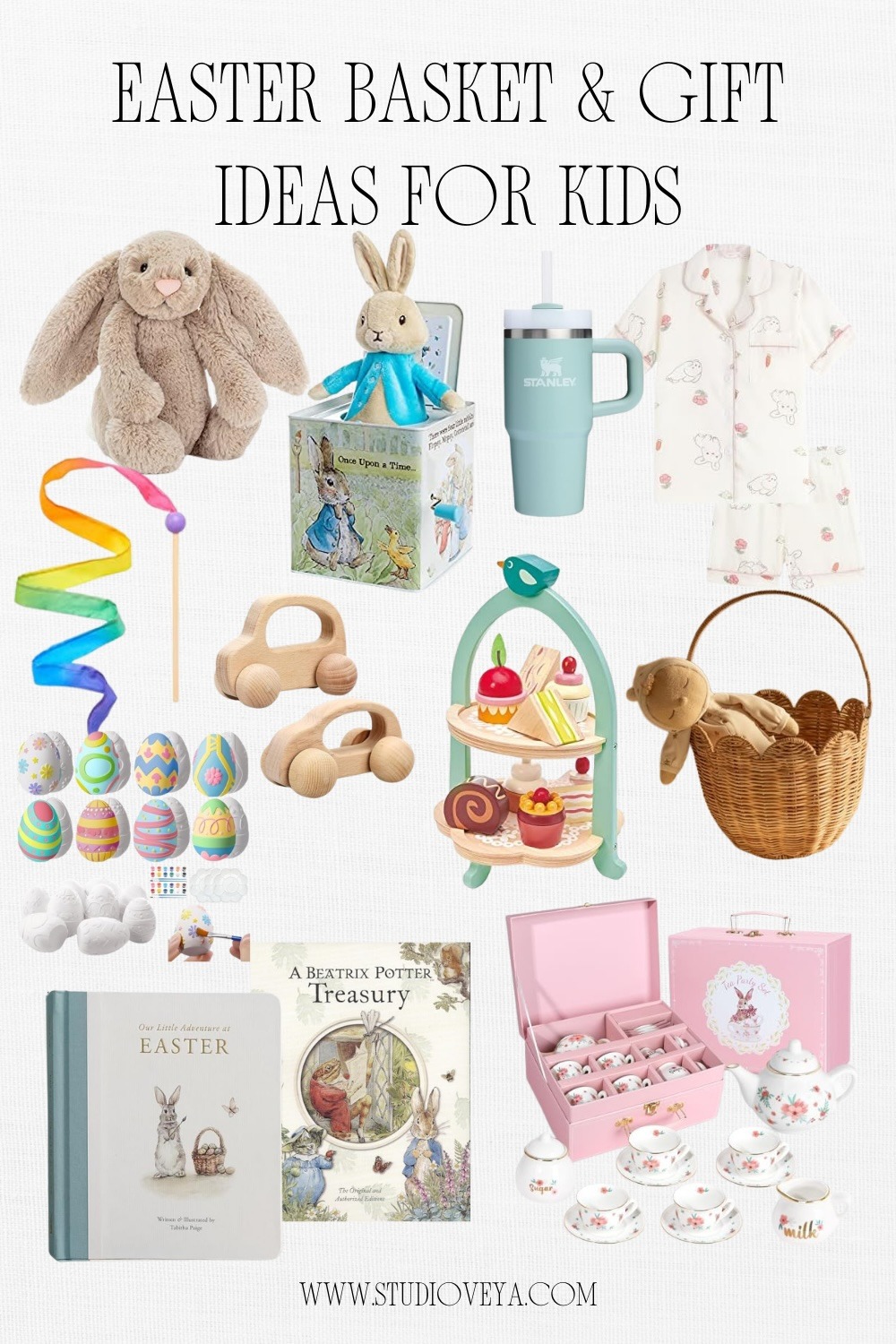 1. Jellycat Bunny 2. Peter Rabbit Jack-in-The-Box 3. STANLEY Tumbler 4. Pajama Set 5. Ribbon Wand 6. Wooden Cars 7. Toy Afternoon Tea Stand 8. Scalloped Basket 9. Easter Egg Craft 10. Our Little Adventure at Easter 11. A Beatrix Potter Treasury 12. Porcelain Tea Set