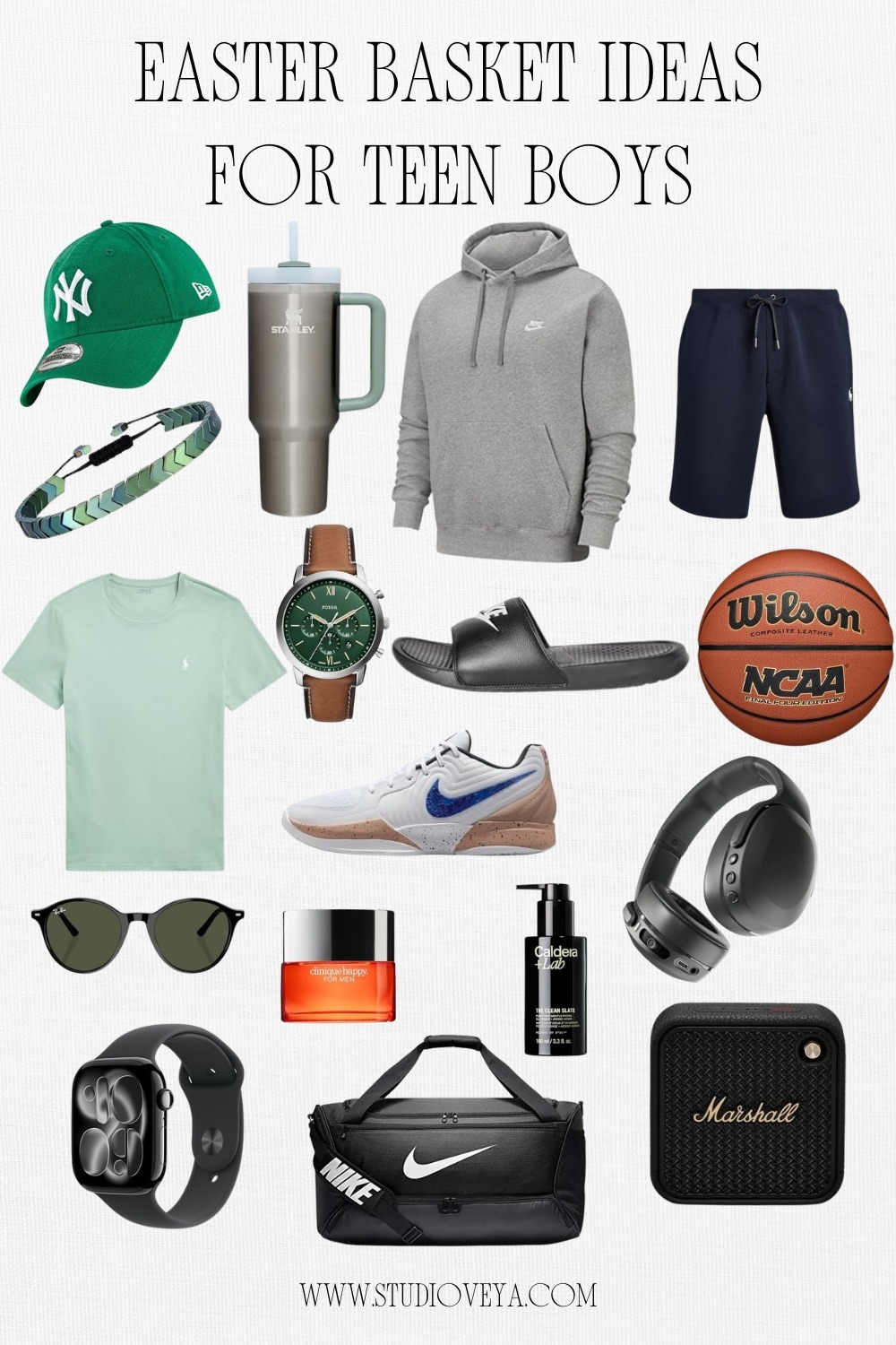 1. MLB Hat 2. STANLEY 3. Nike Hoodie 4. Polo Ralph Lauren Shorts 5. Bracelet 6. Polo Ralph Lauren T-shirt 7. Fossil Watch 8. Nike Sandal 9. WILSON Basketball 10. Ray-Ban Sunglasses 11. Clinique Cologne 12. Caldera + Lab Facial Cleanser 13. Skullcandy Headphones 14. Apple Watch 15. Nike Duffle Bag 16. Marshall Speaker