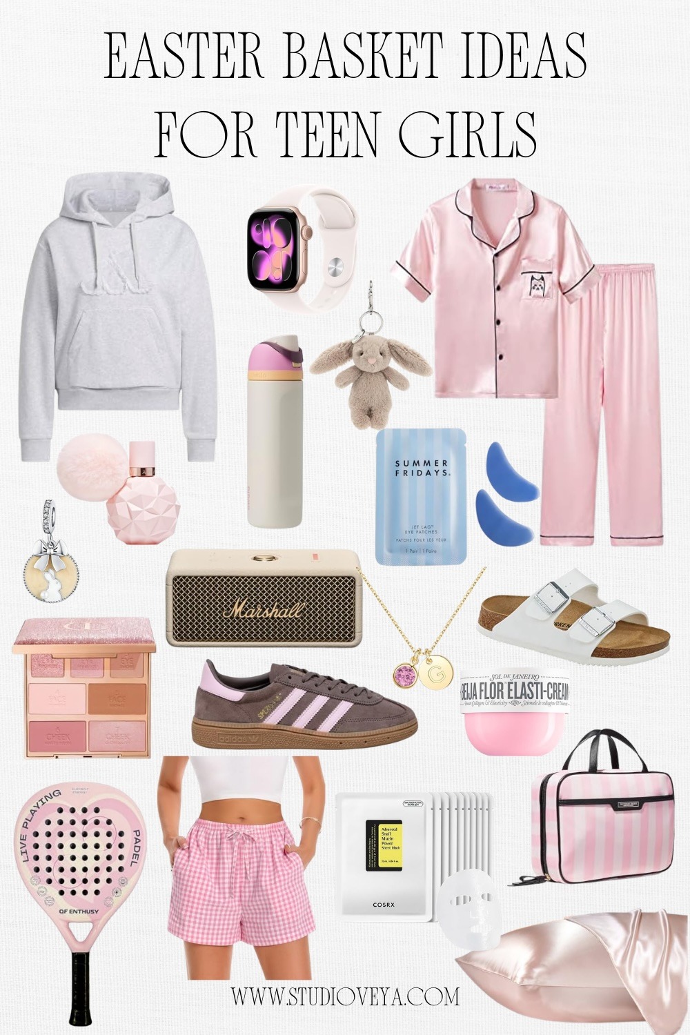 1. adidas Hoodie 2. Apple Watch 3. Satin Pajamas 4. Bunny Charm 5. Ariana Grande Parfum 6. Owala Water Bottle 7. Jellycat Bunny 8. Under Eye Patches 9. Charlotte Tilbury Powder 10. Marshall Bluetooth Speaker 11. Gold-Plated Necklace 12. Birkenstock Sandals 13. Adidas Spezial 14. SOL DE JANEIRO Body Cream 15. Padel Racket 16. Boxer Shorts 17. COSRX Sheet Mask 18. Victoria's Secret Cosmetic Case 19. Silk Pillowcase
