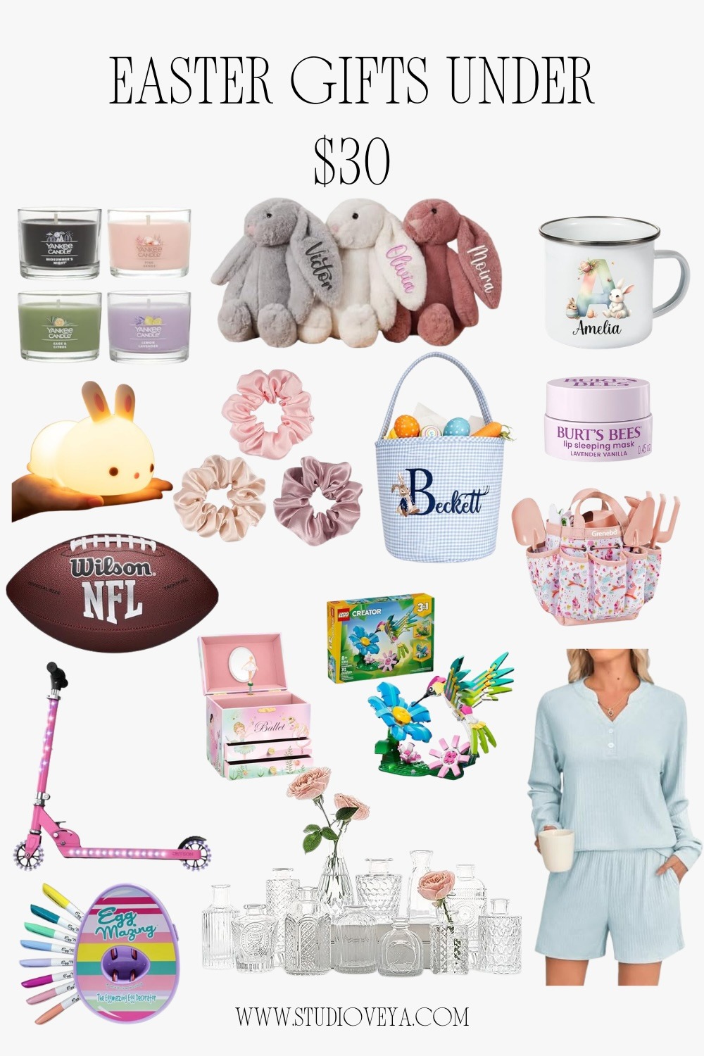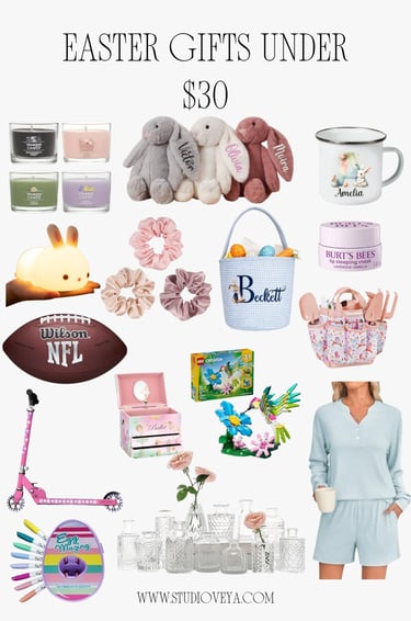 1. Yankee Candle 2. Easter Bunny 3. Easter Mug 4. Night Light 5.Silk Scrunchies 6. Personalized Easter Baskets. 7. Burt’s Bees Lip Sleeping Mask 8. WILSON NFL ball 9. Music Jewelry Box 10. LEGO Creator 11. Light-Up Scooter 12. Egg Decorator Kit 13. Glass Bud Vase Set 14. Knit 2 Piece Lounge Sets
