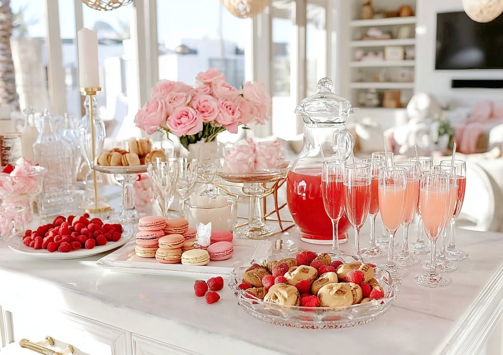 A Galentine’s treat table should look good from every angle but still feel approachable. Less “dessert bar,” more styled brunch moment.