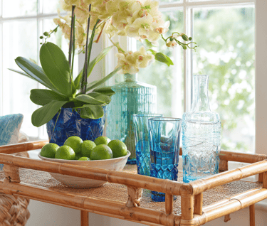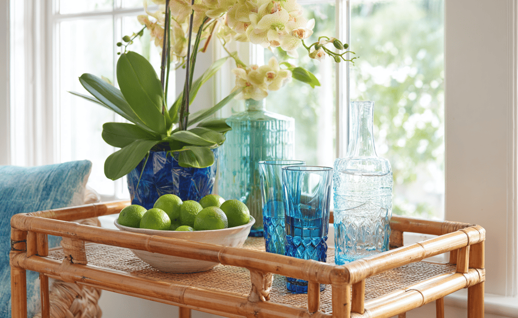 Nothing says effortless entertaining like a beautifully styled bar cart. For a coastal look, start with a rattan or bamboo base. Then layer with blue glassware, sparkling bottles of mineral water, and a pop of fresh citrus in a ceramic bowl. Chinoiserie vases or orchids add a sophisticated edge, while maintaining the relaxed coastal vibe.