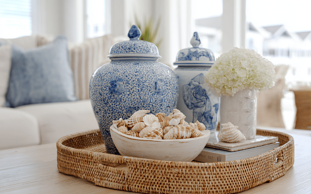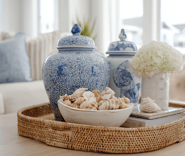 Coffee tables are the perfect place to introduce small vignettes that set the tone for your living room. A woven tray anchors the look, while blue-and-white ginger jars add a timeless coastal feel. Balance them with organic elements like seashells in a whitewashed bowl and fresh hydrangeas in a textured vase. Together, they create a layered and lived-in look that feels polished yet relaxed.