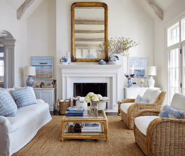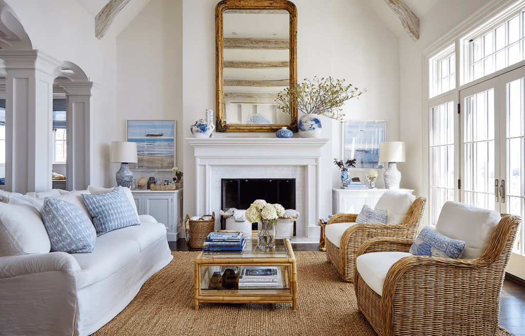 A gilded mirror above the fireplace adds a touch of sophistication while tying in the relaxed elegance of coastal styling. Bring the outdoors in with seascape artwork or large vases of greenery. The overall effect is both airy and welcoming — a space where every detail whispers of calm days by the sea.