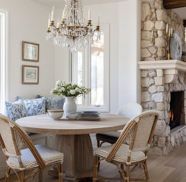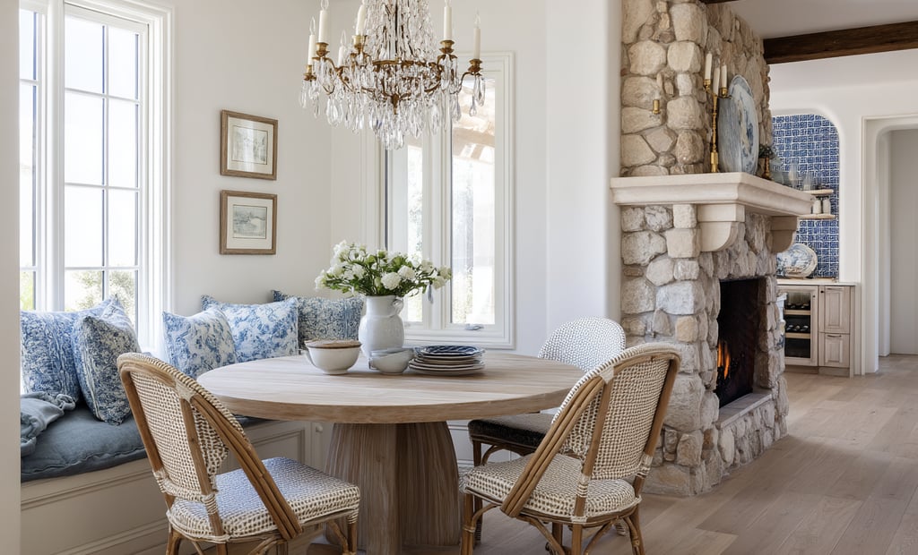 Soft blue cushions, a round wooden table, and a crystal chandelier create a corner meant for slow mornings. Stone, rattan, and linen textures blend seamlessly, giving this dining nook a cozy sophistication.