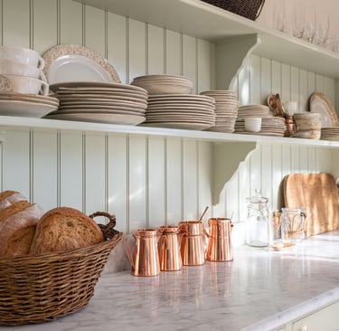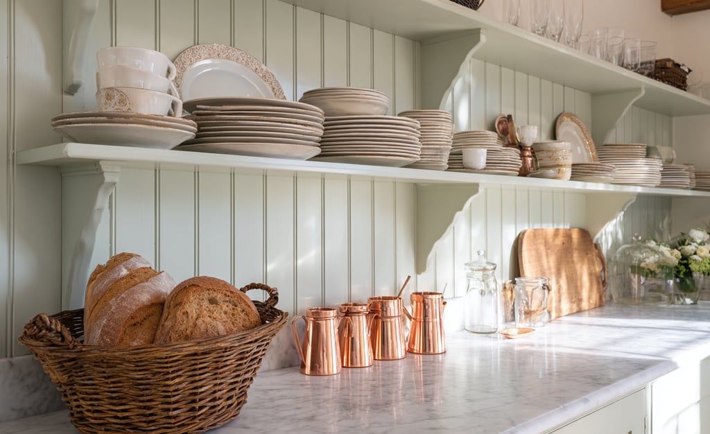 French kitchens celebrate utility and beauty equally. Here, simple open shelving showcases white china and soft green beadboard, paired with marble counters and warm copper accents. Every detail feels honest and inviting.