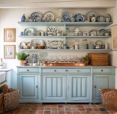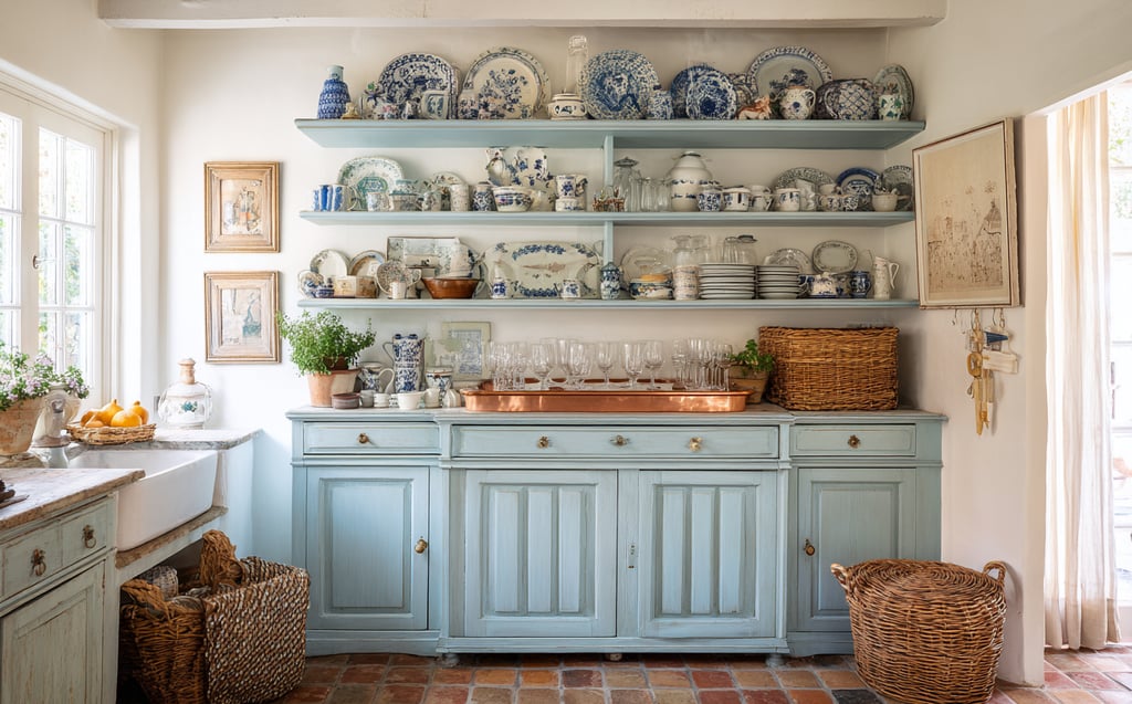 A blue-painted hutch filled with vintage plates and glassware tells a story of gatherings past. Each piece adds a layer of character — mismatched yet harmonious in palette and patina. Wicker baskets beneath complete the grounded, rural elegance.