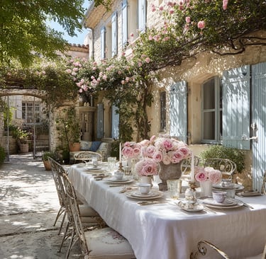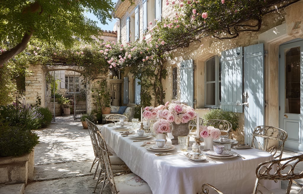 Imagine breakfast beneath flowering vines and the scent of roses drifting through the air. This courtyard dining scene captures the romantic ease of the French countryside — weathered stone, powder-blue shutters, and a linen-draped table set with porcelain and fresh peonies.