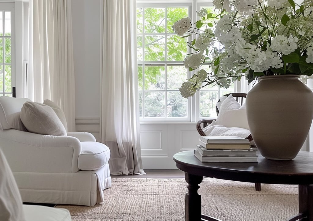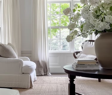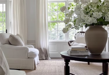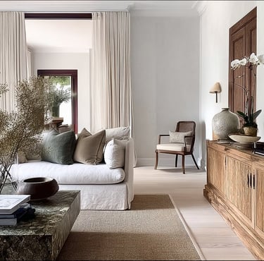 This space shows how a soft neutral foundation creates instant calm. Warm white walls, gently draped curtains, and upholstered seating in creamy tones allow the room to feel light, relaxed, and timeless. The neutral palette keeps everything cohesive, while natural light and simple materials prevent the space from feeling flat or cold.