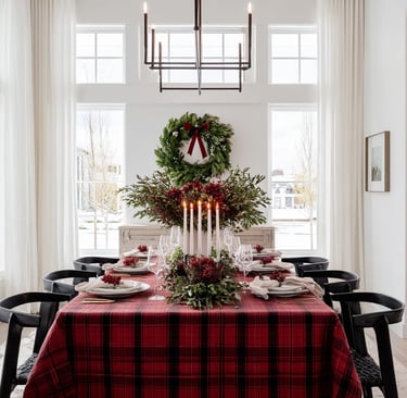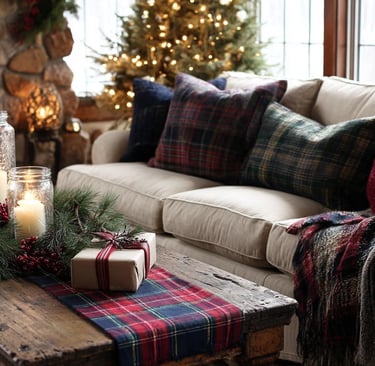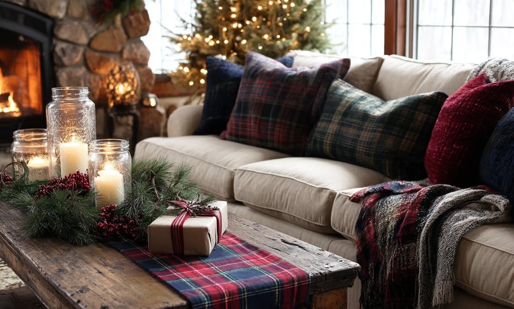 Rich plaids, natural greenery, and candlelight create a warm lodge-inspired space perfect for relaxed holiday gatherings.