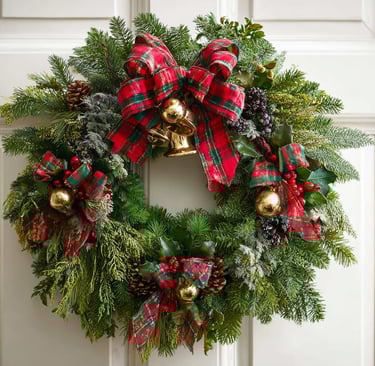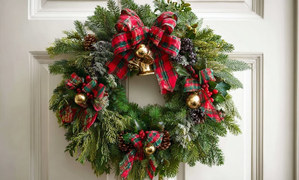 This festive plaid wreath sets a welcoming tone at the door with its rich greenery, gold bells, and timeless holiday charm.