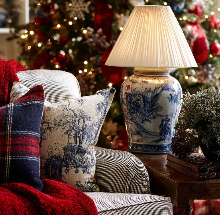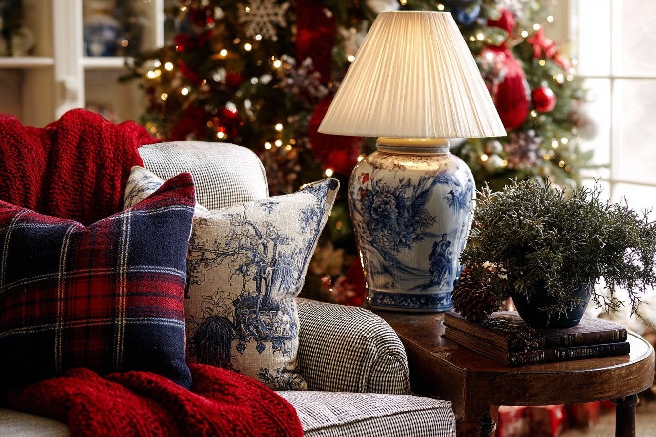 Start with your base fabrics. A simple gingham or tweed armchair becomes the perfect canvas for layered holiday textiles. Add a bold red throw for warmth, then pair contrasting cushions — one in tartan and one in toile — to create that unmistakable RL charm. A blue-and-white lamp adds instant sophistication and ties the vignette together.